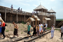 На деревянных крепостных воротах изображение солнца. А вверху, над воротами, смотровая площадка для стражников, готовых в любую минуту отразить атаку неприятеля стрелой из лука. Удивлению нет предела: словно в раннее средневековье перешагнул на машине времени. Стучат топоры, строятся избы. Тут же сувенирная лавка, бревенчатый детский городок с исконными русскими богатырскими играми-забавами.