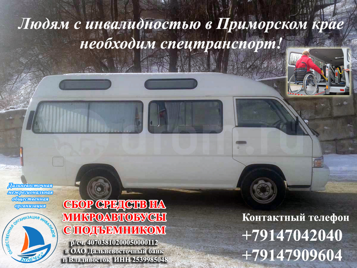 Дальневосточная межрегиональная общественная организация инвалидов «Ковчег» взывает к гражданам Приморья с просьбой помочь собрать необходимую сумму для приобретения специальных микроавтобусов с подъёмниками в рамках марафона благотворительной помощи «Не останусь равнодушным».