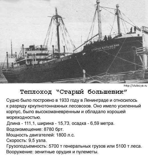 Этот однопалубный теплоход был построен в Ленинграде в 1933 году, его дедвейт (полная грузоподъёмность) составлял 6,1 тысячи тонн, а двигатель завода «Русский дизель» в 2400 лошадиных сил позволял развивать скорость с грузом на борту до 11 миль в час. «Старый большевик» предназначался в основном для перевозки леса. Перед отправкой в составе РQ-16 силами команды был сделан ремонт главной машины, а союзниками установлены два спаренных пулемёта, четыре ракетницы для стрельбы парашютами, баллоны со смесью для дымовой завесы.