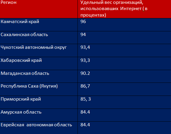 Из одиннадцати субъектов, входящих в состав Дальневосточного федерального округа, первым по уроню распространённости интернета стал Камчатский край. Согласно данным Росстата, 96 процентов организаций на полуострове имеют доступ к глобальной паутине, в то время как в Приморье этот показатель составил всего 85, 3 процента.