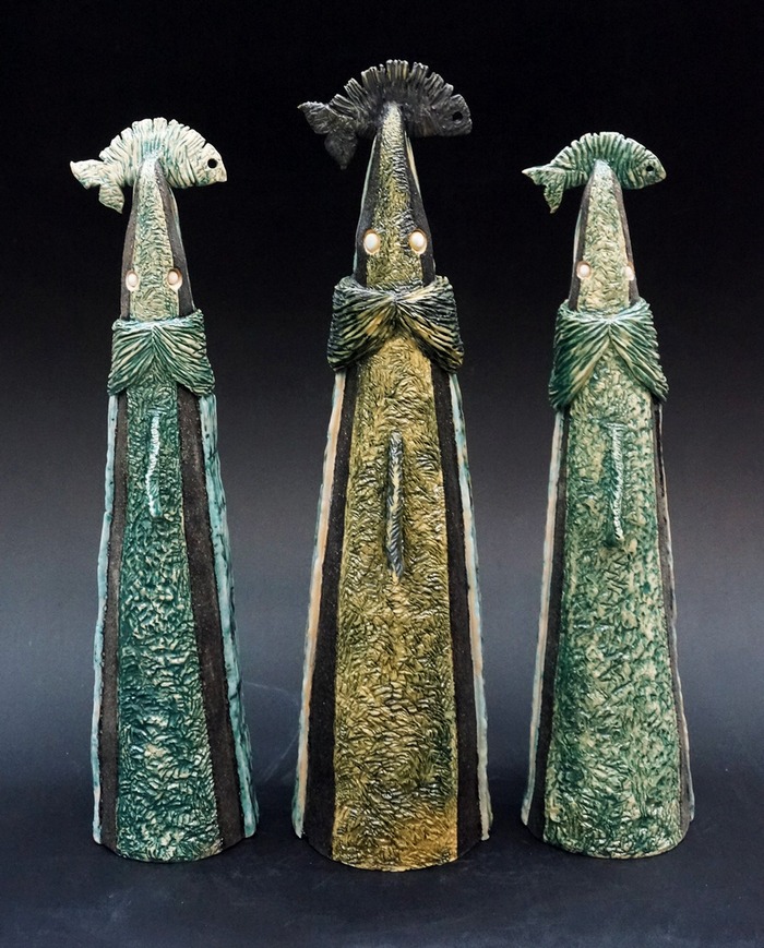 Керамисты из Хабаровска Константин и Альбина Гречановы и Тамара Перепёлкина представили серию работ, в которых переплелись этнографические и модернистские мотивы. Альбина и Тамара молодые авторы, знакомые публике Владивостока по участию в Молодёжных выставках. Константин уже известен своей фирменной этнографической темой и техникой раку, которая была выбрана им как наиболее органичная для воплощения образов, связанных с архаической культурой. Освоив несколько лет назад технику чёрного обжига на одном из симпозиумов по керамике на Ольхоне, Константин положил начало серии выразительных образов хранительниц, архаических существ, зверей. Их фигуры отличаются особой пластикой и эстетикой решения.
