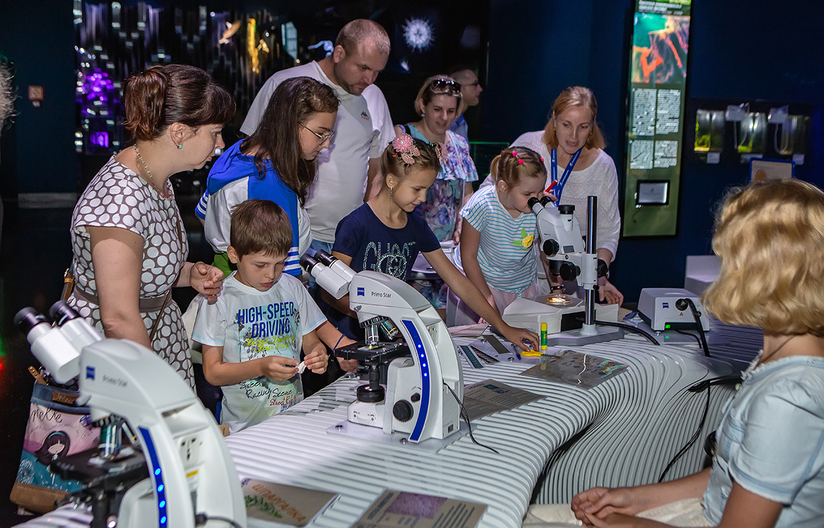 На лабораторном практикуме школьники узнали, чем растения отличаются от животных на клеточном уровне. А те, кто ещё не пошёл в школу, с помощью микроскопа выяснили, чем живое отличается от неживого. Один из маленьких исследователей – серьёзный человек Макар –разглядывая в микроскоп дафнию, сообщил, что ему пять лет, но в морской дневник ему сегодня ставят одни пятерки.