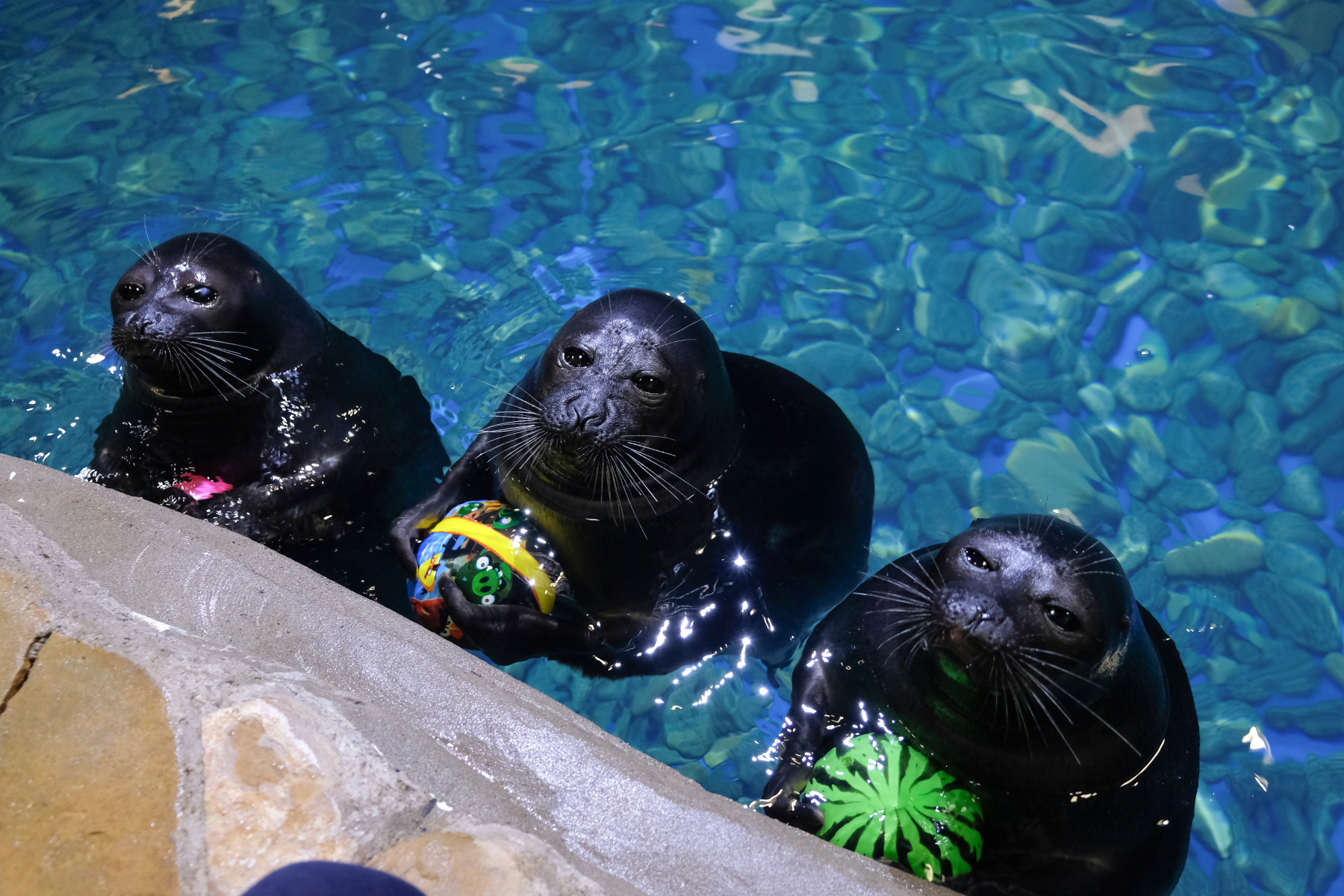 Байкальские нерпы Приморского океанариума в последнее время освоили несколько новых элементов с мячами, переняли друг у друга манеру прощаясь с наставниками после тренировки, хлопать ластом по воде. Скоро в программе обучения появится такой предмет как ИЗО — Альф, Бусинка и Тучка станут учиться рисовать.