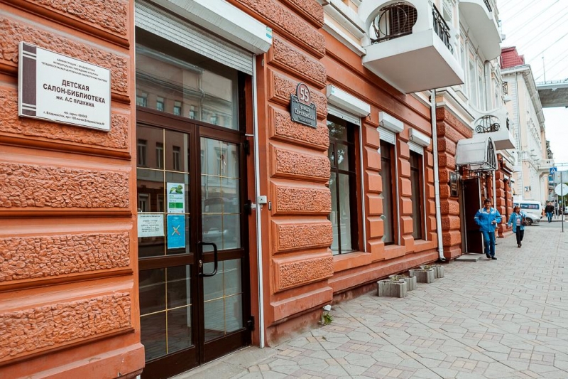 Открывшаяся в 1924 году, первая детская библиотека находилась в деревянном строении в районе остановки «Дальзавод» и носила имя Ф.М. Достоевского. Потом библиотеке выделили помещения в здании на Ленинской (ныне Светланской), 55. 17 июня 1949 года Комитет Владивостокского горисполкома принимает решение за № 232, в котором сказано: «Впредь именовать детскую библиотеку: Владивостокская детская библиотека имени А.С. Пушкина». Это произошло в год 150-летнего юбилея поэта. За два года до 200-летия А.С. Пушкина она стала называться так: «Детская библиотека –салон имени А.С. Пушкина».