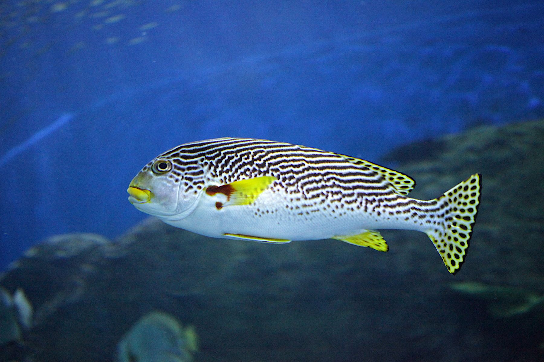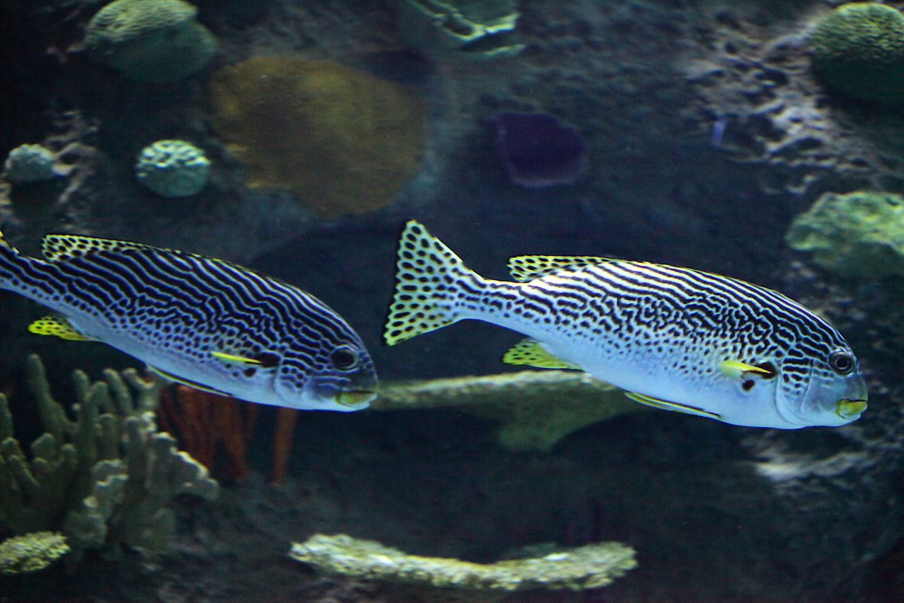 Днём сладкогубы могут сбиваться в стаи и отдыхать группами, ночью они преимущественно охотятся в гордом одиночестве. В тоннеле экспозиции «Тропические моря» живут два взрослых полуметровых полосатых сладкогуба Plectorhinchus lineatus. Рыбы прибыли в океанариум парой в 2016 году и с того времени неизменно держатся вместе, потому, что они — стая.