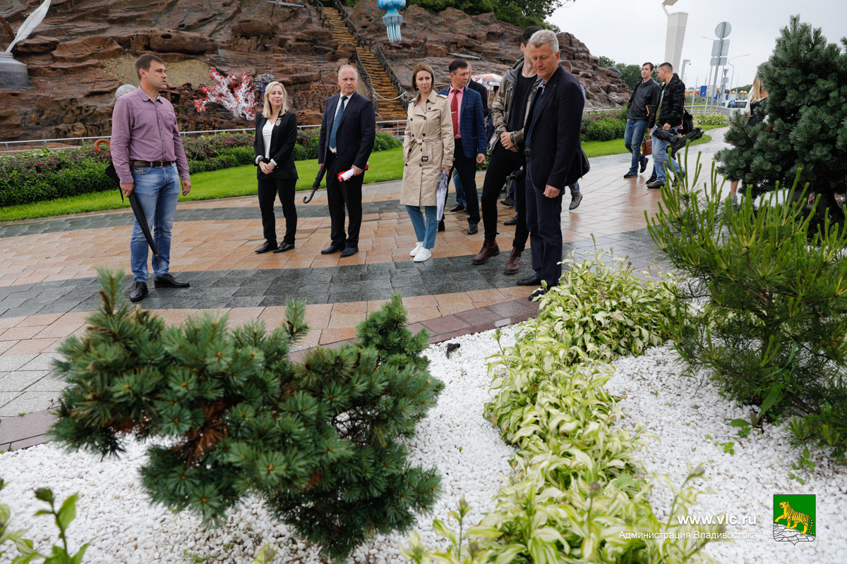 Начальник отдела обслуживания территории Приморского океанариума Аркадий Безделев рассказал главе города Олегу Гуменюку и сотрудникам профильных управлений мэрии о том, как были нивелированы климатические проблемы при высадке и уходе за зелёными насаждениями на территории океанариума.